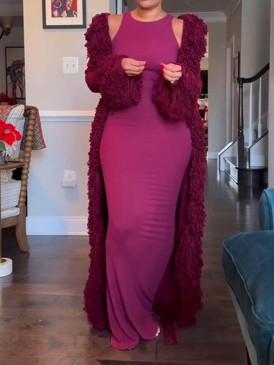 Fashion V-neck Button Bubble Sleeve Maxi Dress