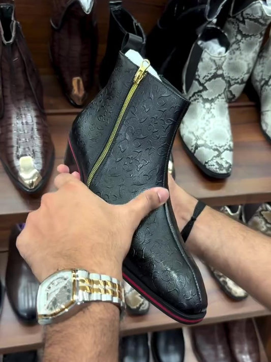 Men's Black Chunky Heeled Pointed-toe Zip-up Boots