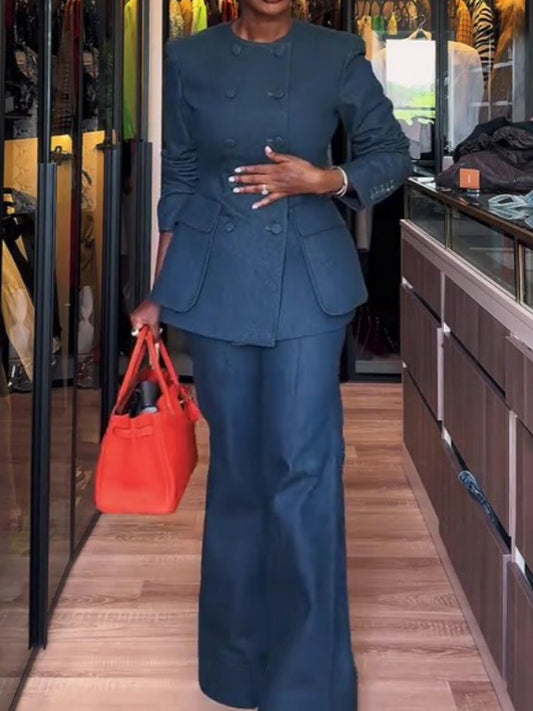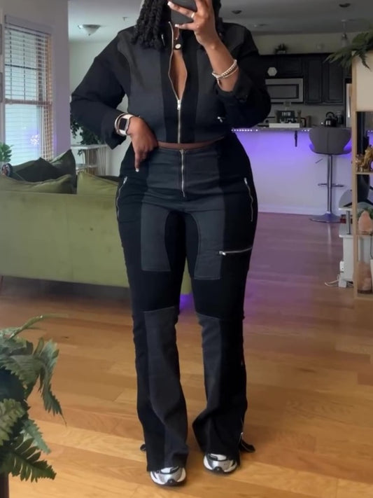 Denim Biker Crop Long Sleeve Jacket And Bootcut Jeans Set