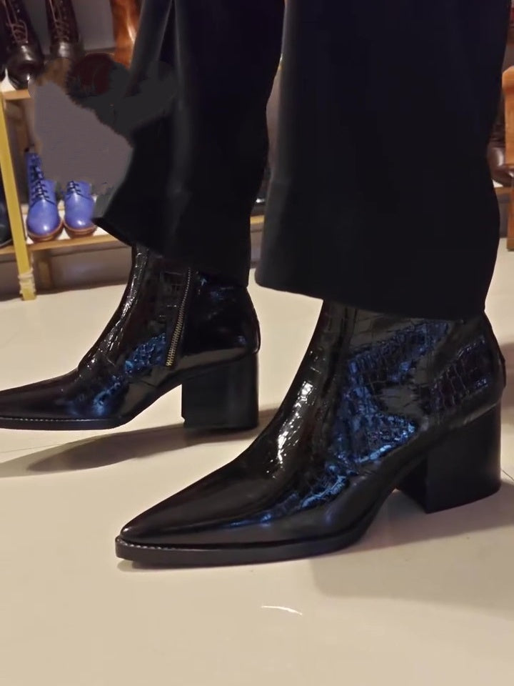 Men's Black Chunky Heeled Pointed-toe Zip-up Boots