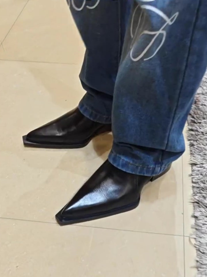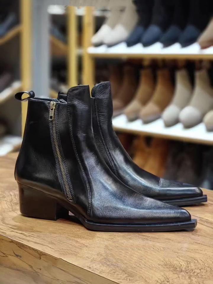 Men's Pointed Toe Chunky Heel Short Leather Boots
