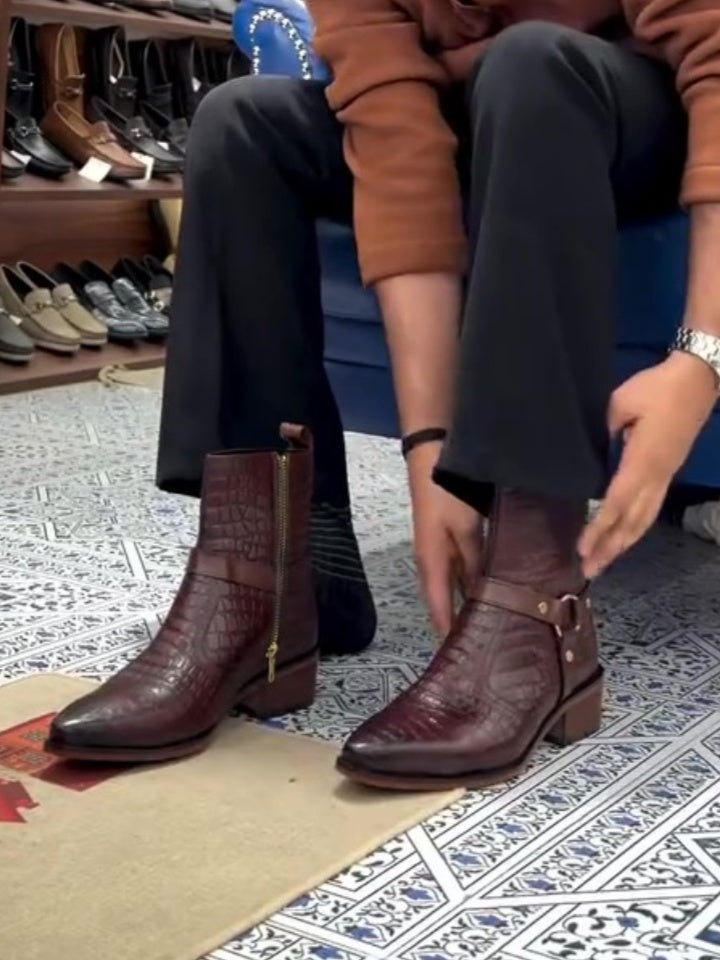 Crafted with precision stitching and premium textured leather, these boots feature a pointed toe silhouette, a durable metal side zipper, and a comfortable low block heel—making them the ideal fusion of style, comfort, and craftsmanship.