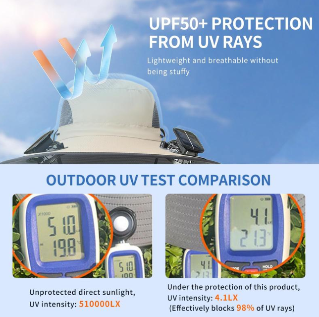 The hat features built-in dual fans that automatically activate when exposed to direct sunlight. The integrated single-crystal solar panel converts sunlight into energy to power the fans no need for batteries or switches. For non-sunny conditions, the fan also supports USB charging for continuous use.